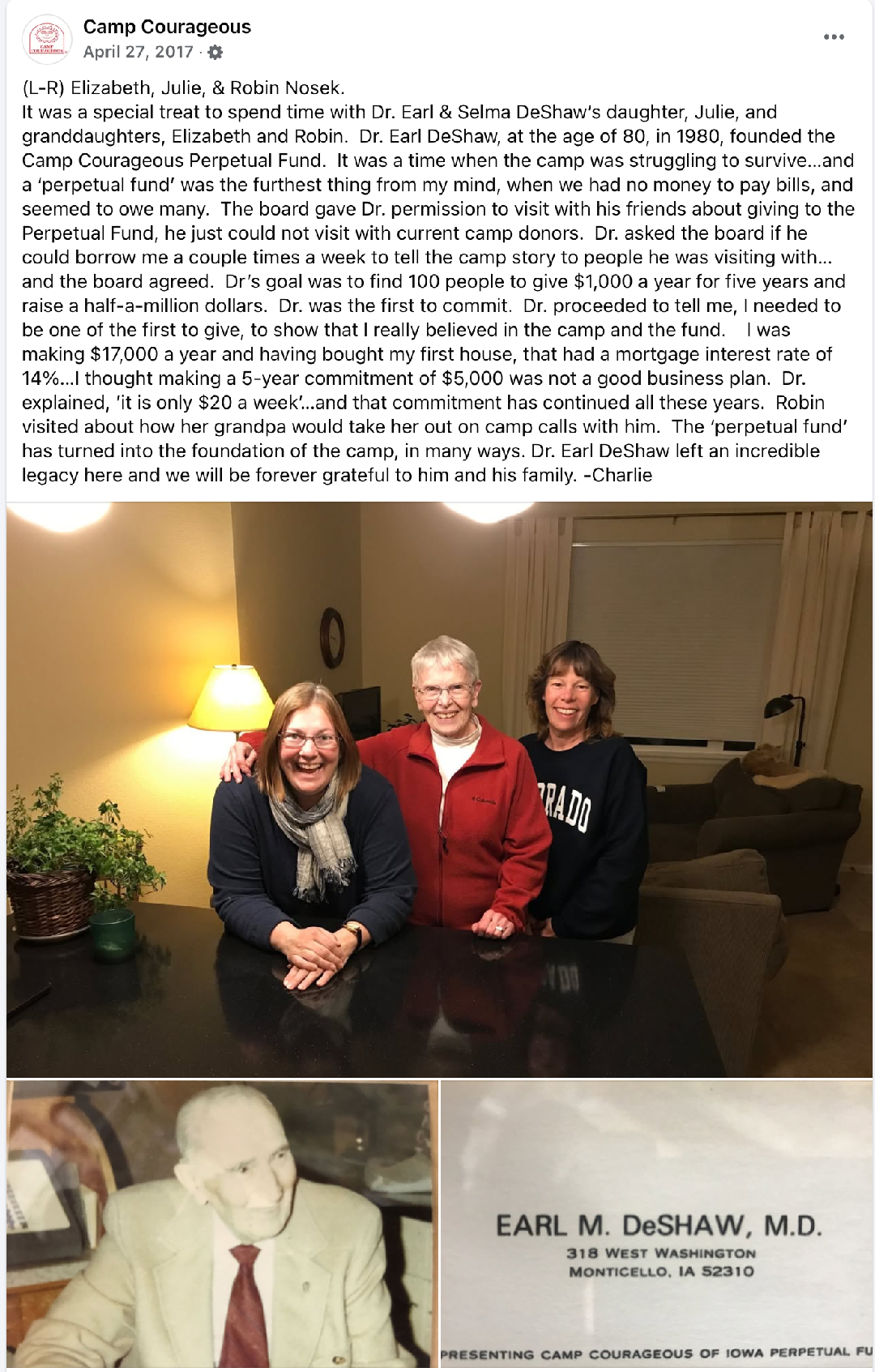 At this same time, the camp was building an indoor pool, (which it did not have the funds to be building), much of my time was spent on the phone letting creditors know the camp was doing all it could to pay its bills, there was no money to pay my position of director, an annual salary of $17,000…and we were talking about putting money on interest? Dr. DeShaw told the Camp Courageous Board he would volunteer five-years of his life (he was 80-years-old at the time). In reality, Dr. DeShaw would volunteer the rest of his life, passing at the age of 91. His objective was to find 100 people to join him in giving $1,000 a year for five-years. Dr. DeShaw was the first in and he soon convinced me that at $20 a week I would be there in no time…this $5,000 pledge over five-years, with a wage of $17,000/year, my first mortgage and first child, was monumental. Dr. DeShaw quickly gathered friends like Jim Maurice from the Monticello State Bank to be Treasurer and Wilfred Shellenbarger from Farmers State Bank in Marion to be on the Perpetual Fund Board.